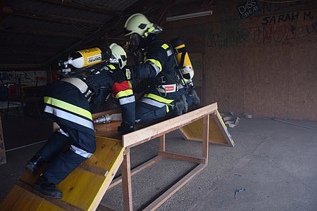 Bei bestem Wetter wurde die Prüfung in der Halle beim Pfarrerteich abgelegt. Das Prüferteam unter der Leitung von Reinhard Holzmüller achtete bei den einzelnen Stationen auf eine saubere Durchführung der Inhalte. Die Ausbildungsprüfung Atemschutz stellt sich aus vier Stationen zusammen: Bei der Station "Ausrüsten" werden vom Trupp die Atemschutzgeräte unter Zeitdruck angelegt. Die Station "Personensuche" beinhaltet die Suche einer Übungspuppe in einem verdunkelten und vernebelten Raum, welcher zusätzlich gekennzeichnete Gefahrengüter beinhaltet - diese müssen ebenfalls gesucht und identifiziert werden. Nachdem die Übungspuppe aus dem Gefahrenbereich gebracht wurde wird in der Station "Löschangriff" mit am C-Druckschlauch angeschlossenem Mehrzweckstrahlrohr eine Hindernisstrecke überwunden. In der letzten Station "Geräteversorgung" wird die Einsatzbereitschaft wiederhergestellt und eine Hochdichtprüfung der Atemschutzgeräte durchgeführt. Parallel dazu hat der Gruppenkommandant noch spezifische Fragen zu beantworten.