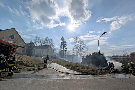 In seiner Abwesenheit entzündete sich das Feuer jedoch erneut und breitete sich durch den böigen Wind rasch über eine angrenzende Böschung in Richtung eines Nachbarhauses aus. Geistesgegenwärtig bemerkte die Nachbarin die bedrohliche Situation und alarmierte umgehend die Feuerwehr.
