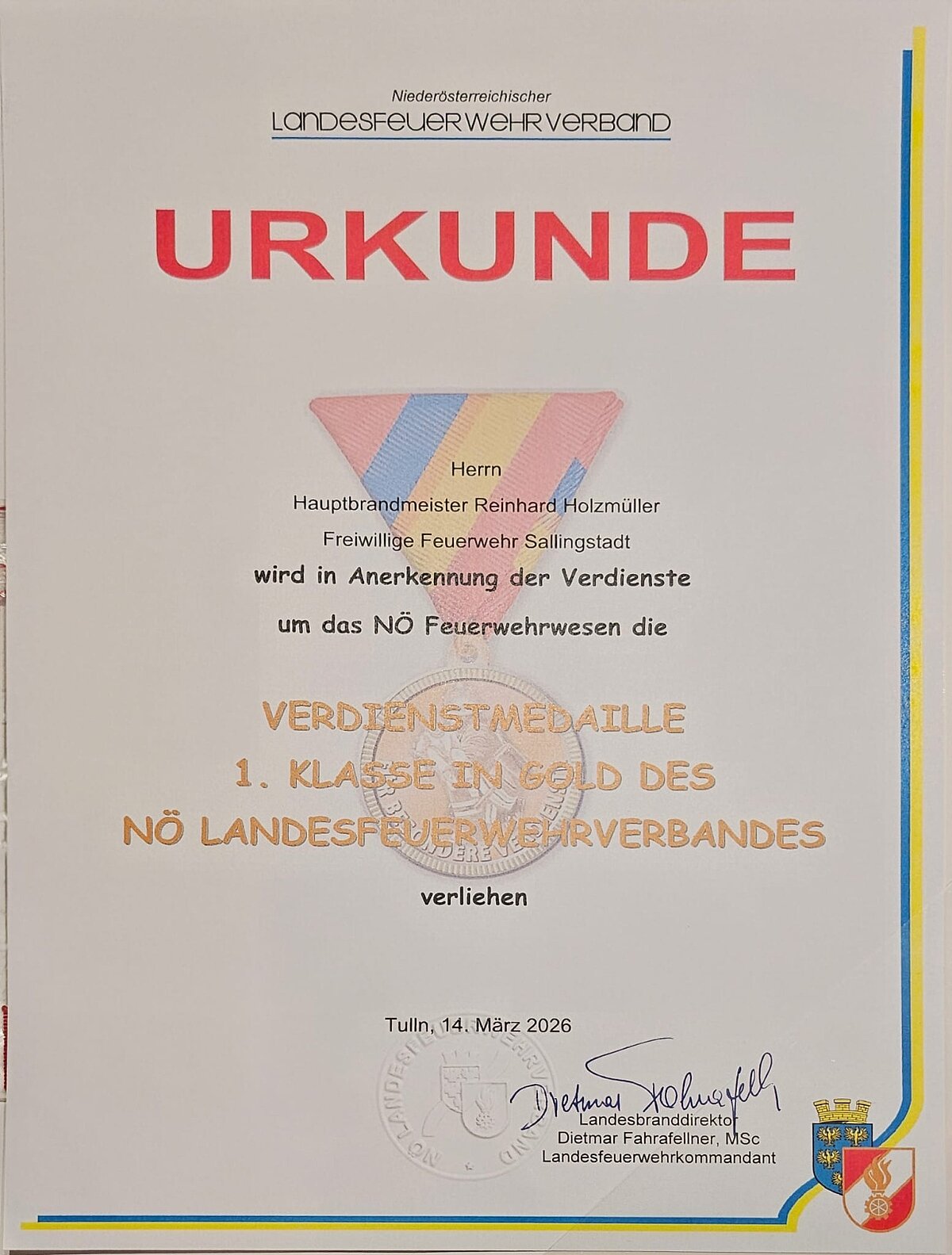 Er erhielt die Verdienstmedaille 1. Klasse in Gold des Niederösterreichischen Landesfeuerwehrverbandes. Diese hohe Auszeichnung würdigt sein außergewöhnliches Engagement im Feuerwehrwesen seit seinem Eintritt in die FF Sallingstadt im Jahr 1982.