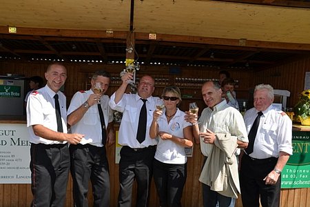 Ein von der Feuerwehr organisierter Bus brachte die teilnehmenden Kameraden plus Partnerinnen zum Festgelände. Nach einer angenehm kurzen Festmesse ging man zum gemütlichen Teil über.
