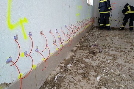 Nach erster Begehung des bereits von Dach, Tor, Fenstern und Einrichtung befreitem Gebäudes wurde im provisorischen Feuerwehrhaus in 2er-Teams jeweils die Sprengplanung und die Berechnung der Ladungen durchgeführt. Die Anzahl und Positionierung der Bohrungen und der jeweiligen Lademenge richtet sich nach dem verwendeten Material der Wände und deren Beschaffenheit. Da sich das Übungsobjekt sehr nahe bei einigen Wohnhäusern befand war es wichtig die optimale Sprengstoffmenge zu treffen.